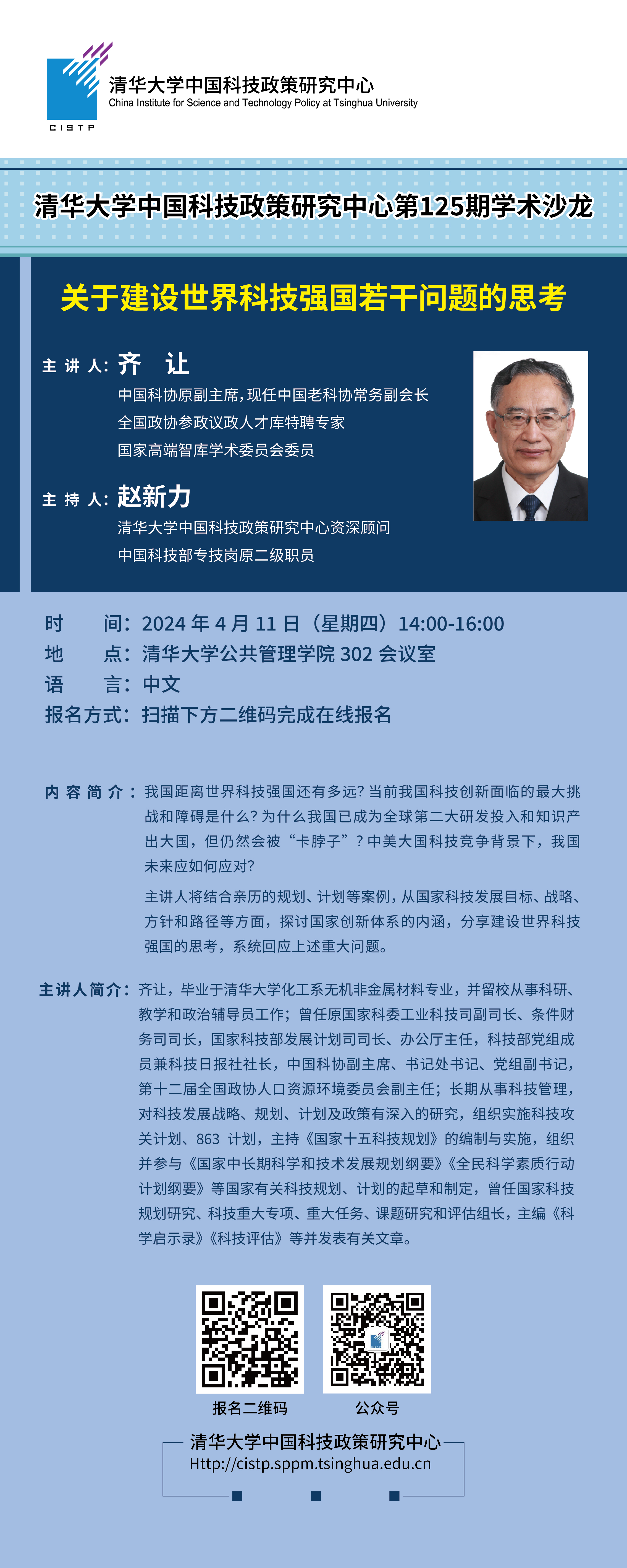 清华大学中国科技政策研究中心第125期学术沙龙:关于建设世界科技强国若干问题的思考(2024年4月11日 星期四 14:00-16:00)