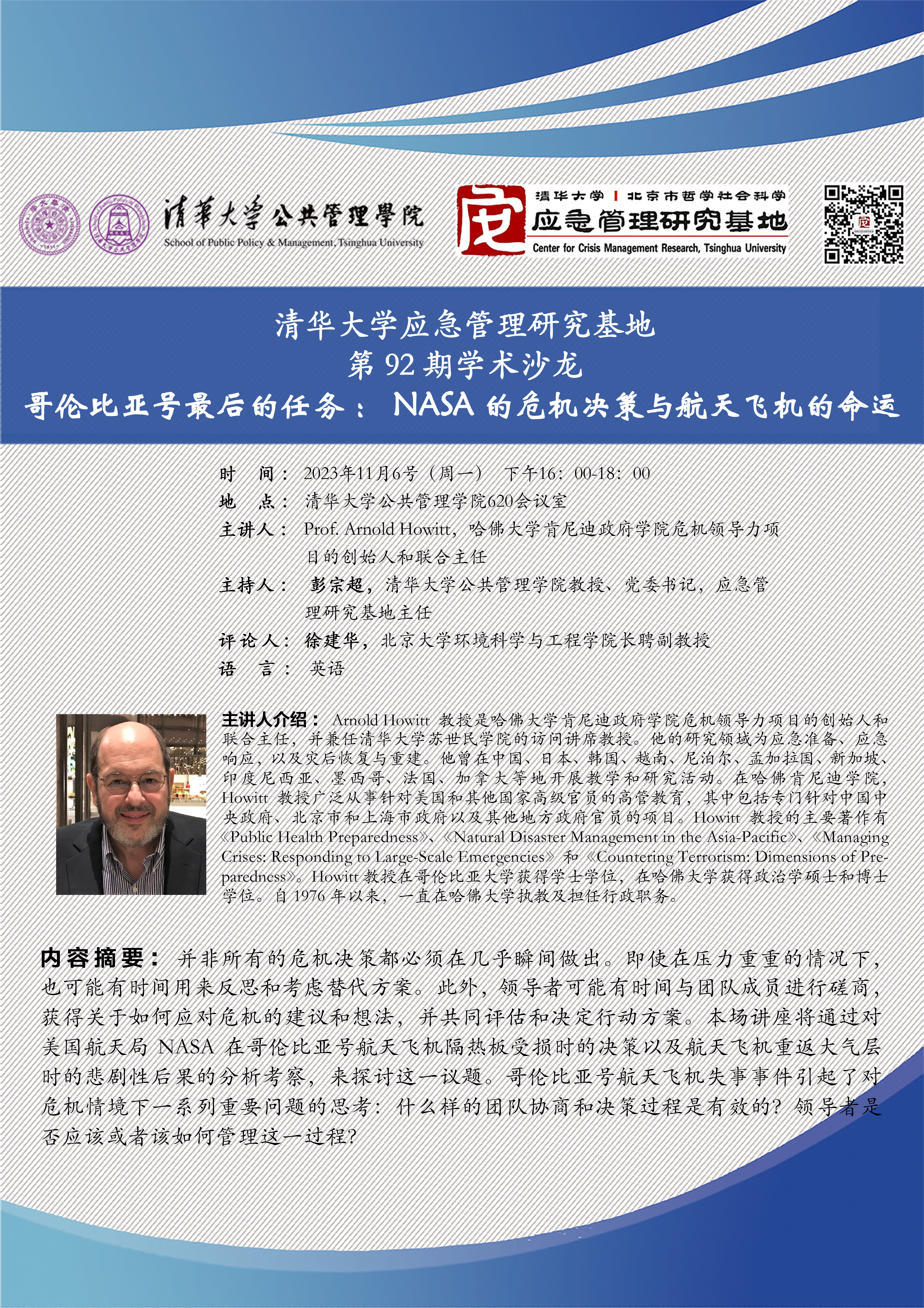 主讲人: Prof. Arnold Howitt,哈佛大学肯尼迪政府学院危机领导力项目的创始人和联合主任