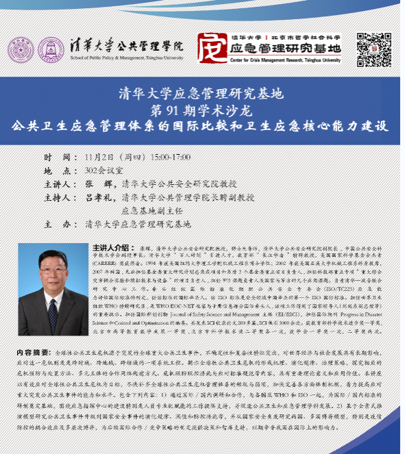 【主讲人简介】 张辉,清华大学公共安全研究院教授,博士生导师,清华大学公共安全研究院副院长,中国公共安全科学技术学会副理事长。清华大学“百人计划”引进人才,教育部“长江学者”特聘教授,美国国家科学基金会杰青(CAREER)奖获得者。1994年获美国纽约大学理工学院机械工程系博士学位;2002年获美国石溪大学机械工程系终身教席,2007年回国,先后担任基金委重大研究计划总集成项目和另外3个基金委重点项目负责人,担任科技部重点专项“重大综合灾害耦合实验和模拟技术与设备”的项目负责人,担任973课题负责人及国家与军方的几个应用课题。负责清华—波音联合研究中心工作。牵头组织国际标准化组织公共安全专委会(ISO/TC223)应急能力评估国际标准的制定,任该标准的国际牵头人。该ISO标准是安全领域中国牵头的第一个ISO国际标准。担任世界卫生组织WHO特聘研究员, 是WHO EOC-NET框架与手册信息部分国际牵头人, 该项工作得到了国家领导人(刘延东副总理等)的重要批示。担任国际新创刊物Journal of Safety Science and Management主编(EI/ESCI),担任国际期刊Progress in Disaster Science和Control and Optimization的编委。共发表SCI收录论文200多篇,SCI他引3000余次。获教育部科学技术进步奖一等奖,北京市高等教育教学成果一等奖, 北京市科学技术奖二等奖各一次,获学会一等奖一次,二等奖两次。