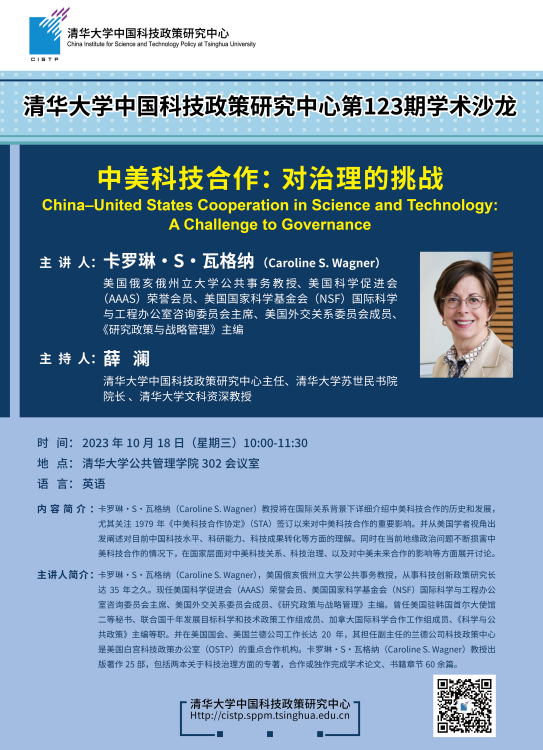 卡罗琳 S・瓦格纳(Caroline S. Wagner)教授将在国际关系背景下详细介绍中美科技合作的历史和发展,尤其关注1979年《中美科技合作协定》(STA)签订以来对中美科技合作的重要影响。并从美国学者视角出发阐述对目前中国科技水平、科研能力、科技成果转化等方面的理解。同时在当前地缘政治问题不断损害中美科技合作的情况下,在国家层面对中美科技关系、科技治理、以及对中美未来合作的影响等方面展开讨论。