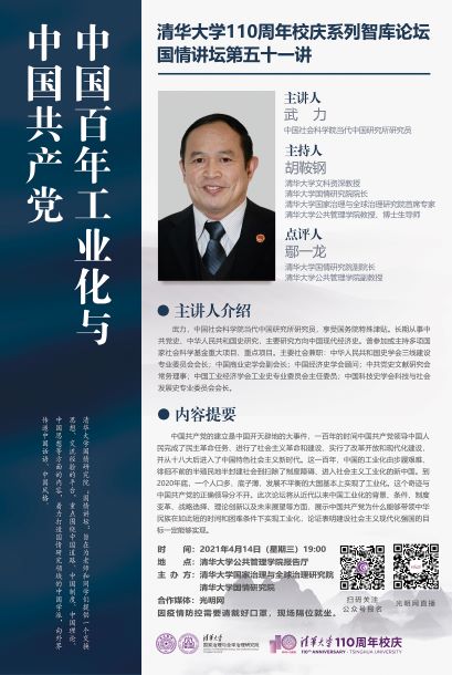 清华大学110周年校庆系列智库论坛之国情讲坛第五十一讲:中国百年工业化与中国共产党(2021年4月14日 星期三 19:00)
