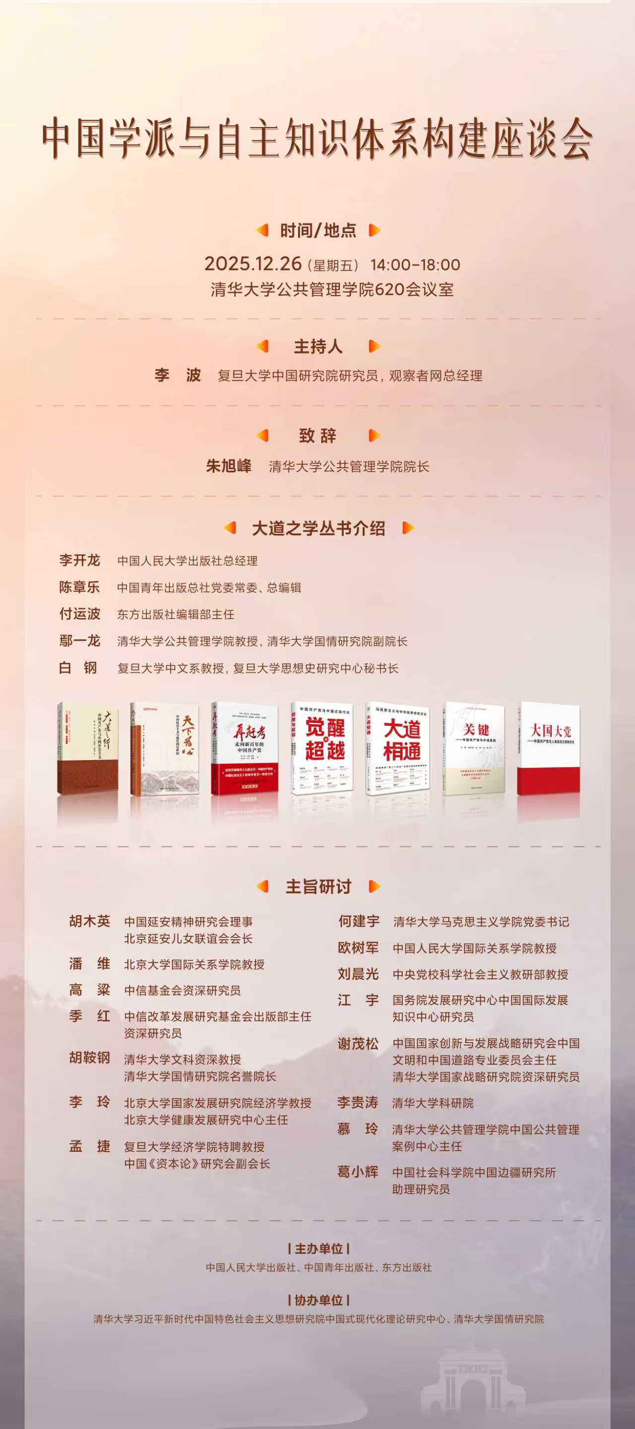 以《大道之行》一书为起点,过去的十年里,我们聚合不同学科志同道合的学者,在中国人民大学出版社、中国青年出版社、东方出版社等支持下,用学术通俗化表达方式,立足于中国实践,共同回应时代重大命题,共同推进思想创新、话语创新、战略创新,共同创作了“大道之学丛书”共七部,《大道之行:中国共产党与中国社会主义》(2015年)、《天下为公:中国社会主义与漫长的21世纪》(2018年)、《再赶考:走向新百年的中国共产党》(2021年)、《觉醒与超越:中国共产党与中国式现代化》(2022年)、《大道相通:马克思主义与中华优秀传统文化》(2023年)、《关键:中国共产党与中国道路》(2024年)、《大国大党:中国共产党与人类政党文明新形态》(2026年初),该丛书产生了广泛的政策影响、学术影响、社会影响、国际影响,累计发行百万册左右,被翻译成十多种语言版本,提出系列创新性话语表述,为构建自主知识体系做出了贡献。