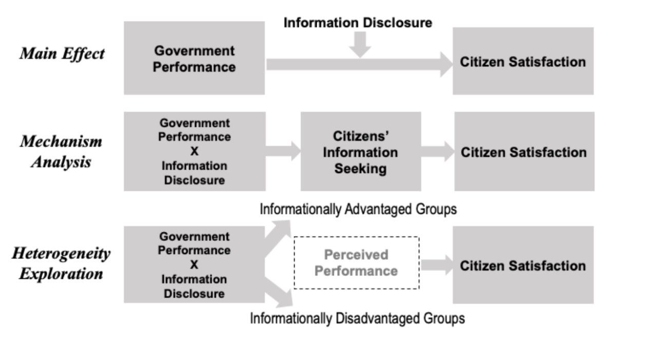 信息公开对民众满意度的影响长期存在争议。此前研究更为关注信息公开的监督效应或民众满意度预期差异的心理效应。少有研究关注信息公开对信息环境的潜在影响。事实上,在现实世界中,信息环境是链接政府绩效与民众满意度的关键因素。民众常因缺乏充分、可信的绩效信息及相关知识,难以对政府表现作出准确评估,导致“绩效-满意度”关联(performance-satisfaction linkage)松散。但是,绩效信息公开是否能够有助于恢复或强化这一关联,仍缺乏在真实、复杂社会环境下的坚实证据。本研究旨在弥合这一研究空白,深入探究绩效信息公开如何作用于民众满意度。