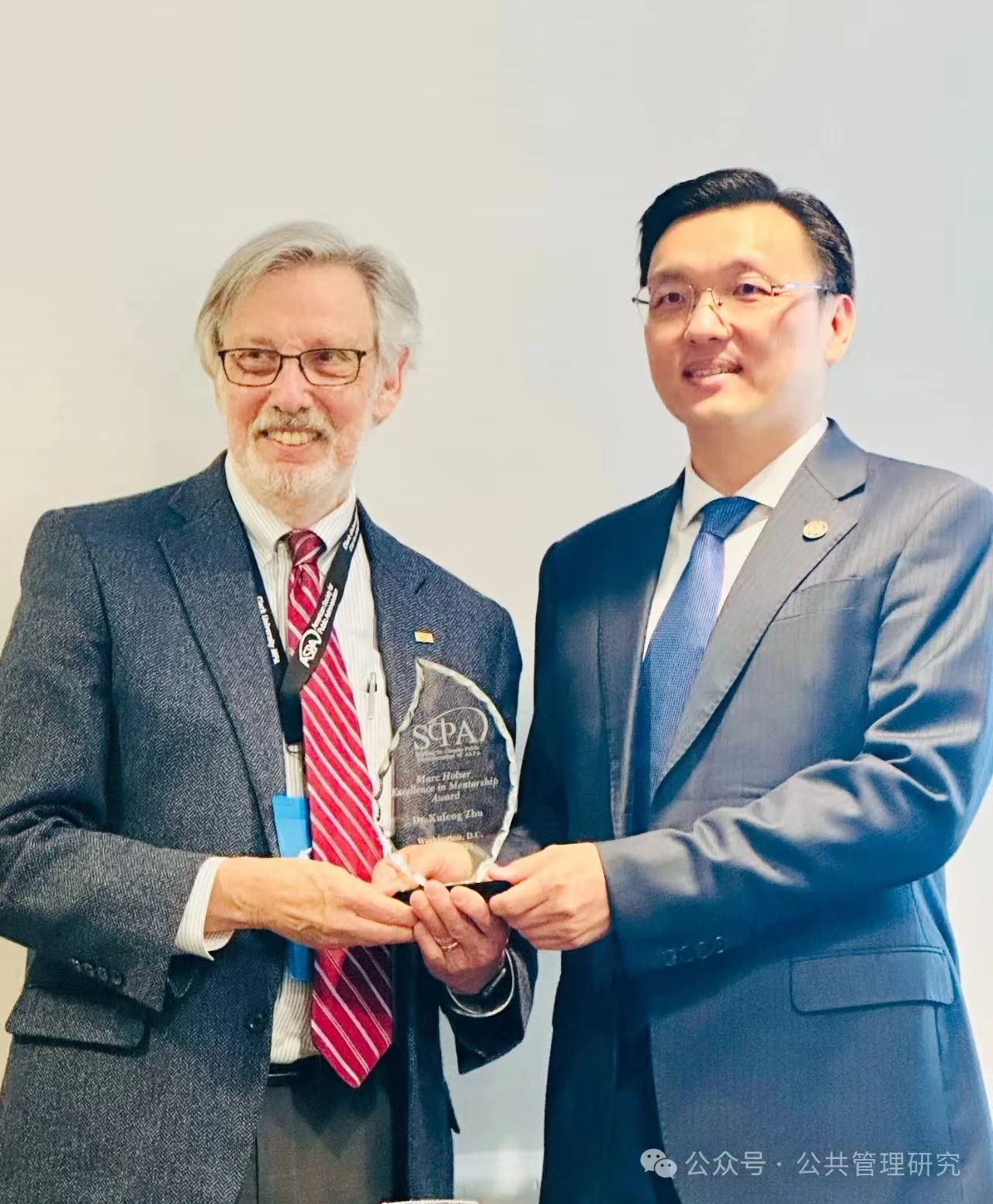 2025年3月29日,美国公共行政学会(ASPA)华人公共行政分会(SCPA)在华盛顿特区五月花酒店召开年度会议,并颁发各类奖项。清华大学公共管理学院院长朱旭峰教授获得2025年度马克·霍哲卓越导师奖(Marc Holzer Excellence in Mentorship Award),霍哲教授亲临现场颁奖并致辞。