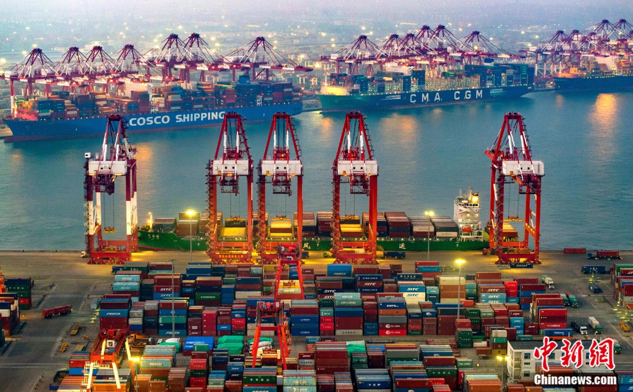资料图:山东港口青岛港前湾集装箱码头泊位饱满,集装箱装卸繁忙有序。韩加君 摄