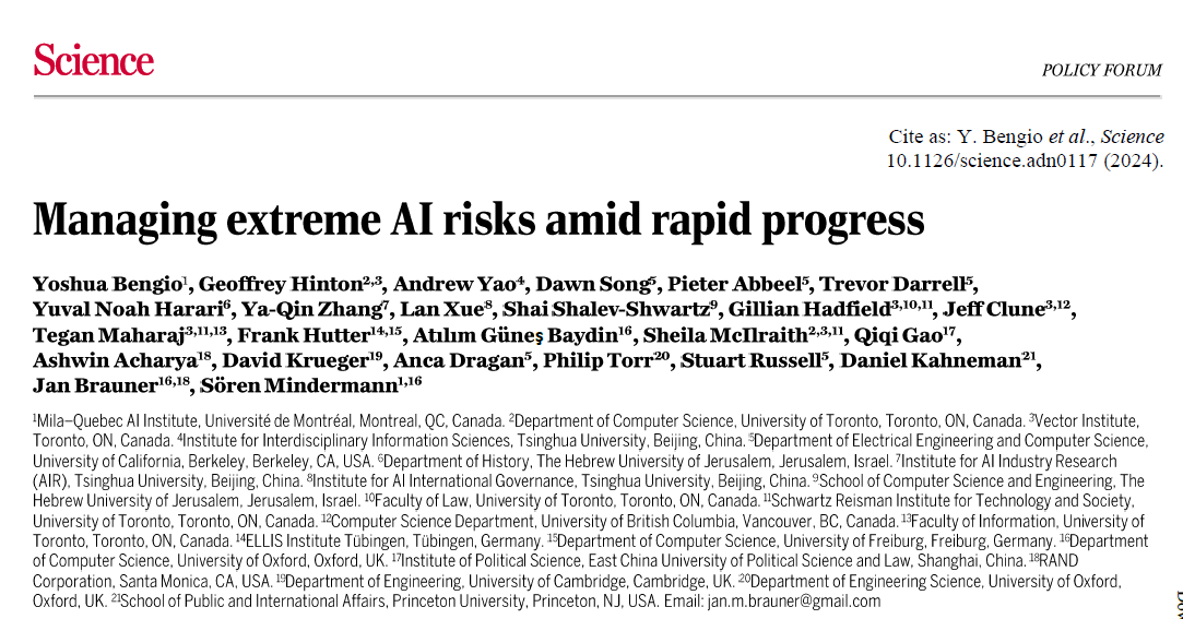 由三位图灵奖得主约书亚·本吉奥(Yoshua Bengio)、杰佛瑞·辛顿(Geoffrey Hinton)、姚期智(Andrew Yao)(清华大学人工智能国际治理研究院学术委员会主席)领衔,连同多位权威专家,包括诺贝尔经济学奖得主丹尼尔·卡内曼 (Daniel Kahneman) 以及清华大学讲席教授张亚勤(清华大学人工智能国际治理研究院学术委员)、文科资深教授薛澜(清华大学苏世民书院院长、公共管理学院学术委员会主任、清华大学人工智能国际治理研究院院长)等共同撰写的文章 “Managing extreme AI risks amid rapid progress”(《人工智能飞速进步背景下的极端风险管理》) 于2024年5月20日发表于美国《科学》杂志。