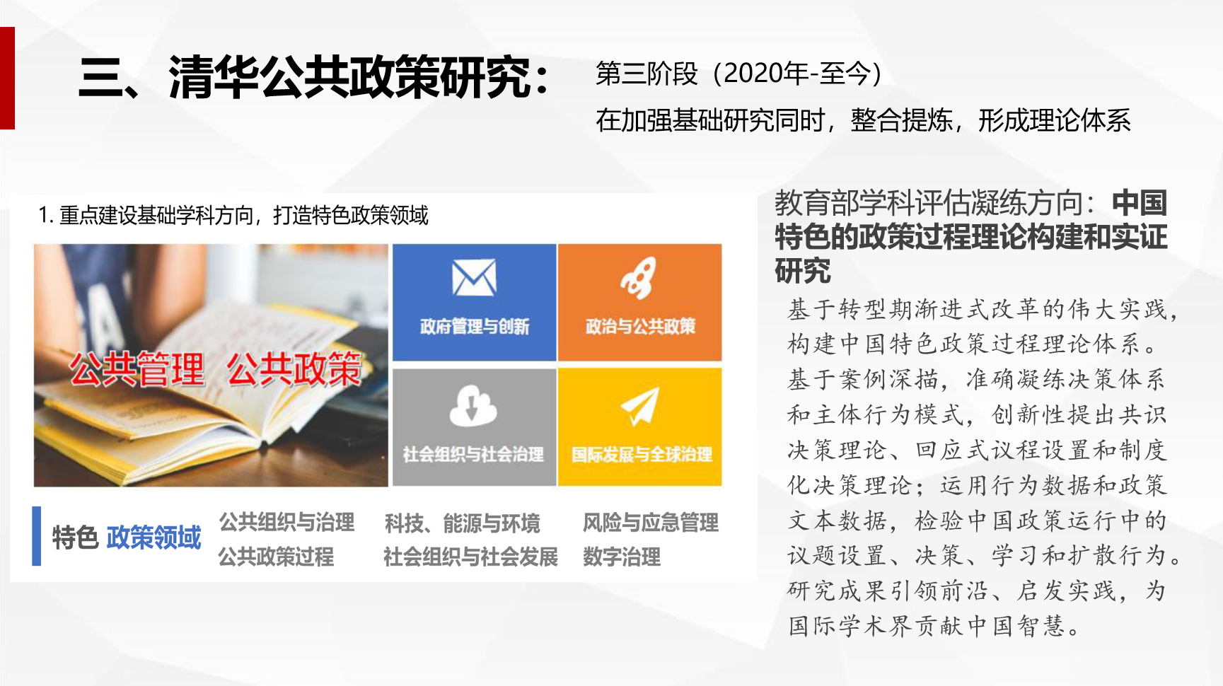 第三阶段,到了今天,我们应该关注如何在加强基础研究的同时,超越具体政策问题,整合提炼,形成独立创新的理论体系。这也是教育部学科评估过程中特别提到的,需要去做的下一步工作——努力构建中国特色的政策过程理论体系。