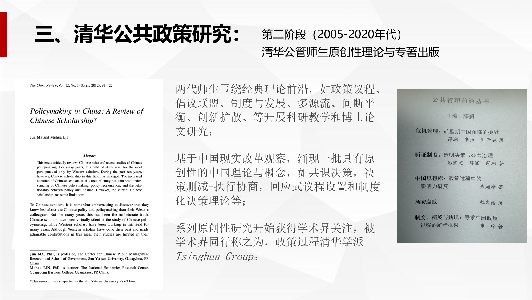 第二阶段是2005-2023年。这个阶段我们开始在公共政策领域的重点问题上做研究,提出了一些原创性的概念和模型,也出版了专著。在这个过程中,公管学院很多老师,包括博士生,基于国外理论框架,结合中国实践,进行探索研究,逐渐产生一批原创性研究,得到了国内、国际同行的认可。前些年有学者回顾中国公共政策研究领域的时候,专门提到“Tsinghua Group”,也就是中国公共政策过程研究的“清华学派”。
