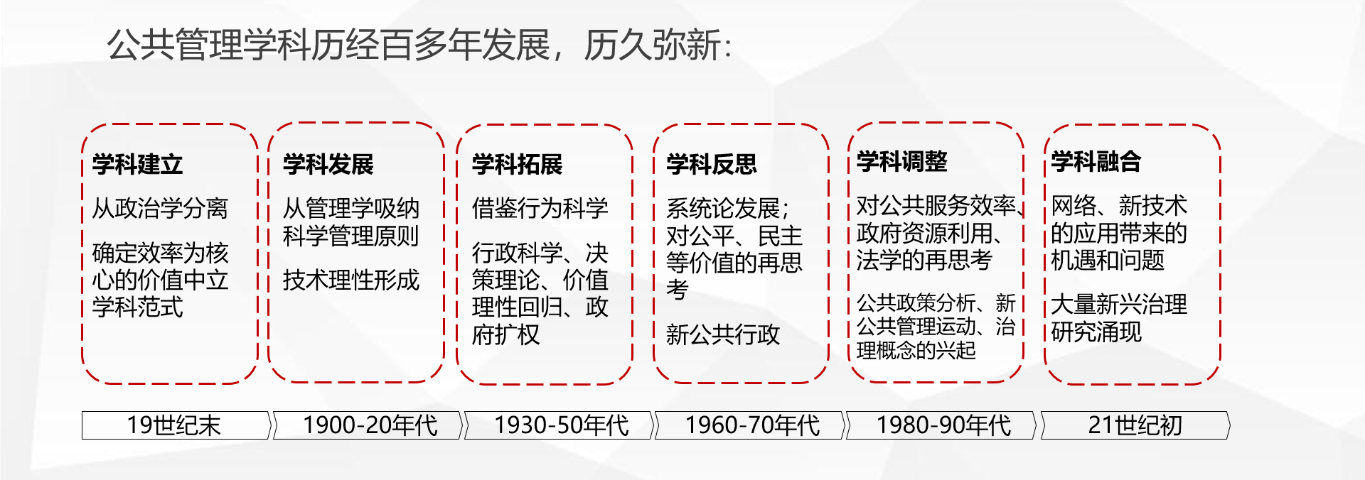 公共管理学科已经经历了一个多世纪的发展。但公共政策的基本理论发展时间较短。大家公认1951年D. Lerner和Lasswell主编《政策科学:视野与方法的近期发展》的出版,是公共政策的学科起点。当然,中国对公共政策问题的研究和实践也非常重视。1986年,万里副总理在《人民日报》发表《决策民主化和科学化是政治体制改革的一个重要课题》一文,也被认为中国公共政策领域发展的里程碑事件。