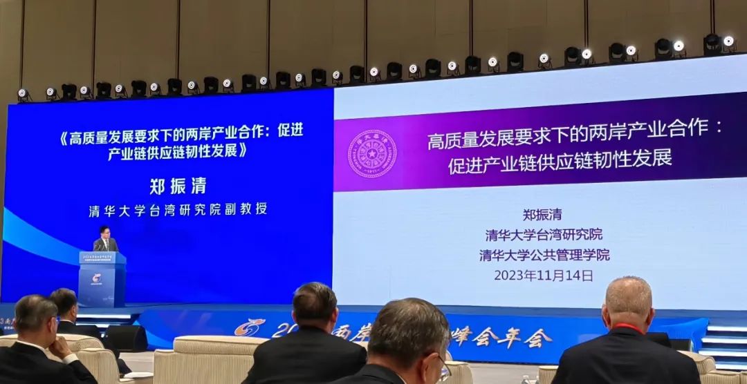 郑振清的主题演讲分析了自2018年初中央政府部门发布 “31条”对台经济文化交流合作措施以来大陆各级政府推行的3000多条对台融合措施的政策过程,提出大陆初步形成一个“涉台公共政策体系”,指出各级政府根据职权职能的差别,在产业政策、社会政策和公共服务同等化(“融合三角”)为两岸融合发展、产业合作和产业链供应链韧性发展提供了差异性的经济社会要素支持,正在塑造两岸命运共同体。郑振清认为,近年来大陆涉台公共政策体系与“融合三角”的实践,意味着国家发展、国家治理与国家统一进程正在有机结合,将为今后祖国完全统一铺垫公共政策轨道与经济社会基础。相关演讲内容的学术基础是郑振清主持的清华大学自主科研计划和国家社科基金项目成果。
