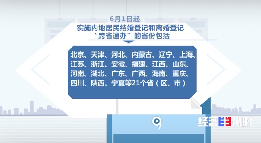 为了解决“人户分离”的准新人们回户籍地办理婚姻登记不便的问题,经国务院批复同意,自2021年6月1日起至2023年5月31日,在辽宁、山东、广东、重庆、四川等省市开展结婚、离婚登记“跨省通办”试点工作。2023年6月,这一试点范围扩大了到了21个省份,覆盖中国总人口的78.5%。