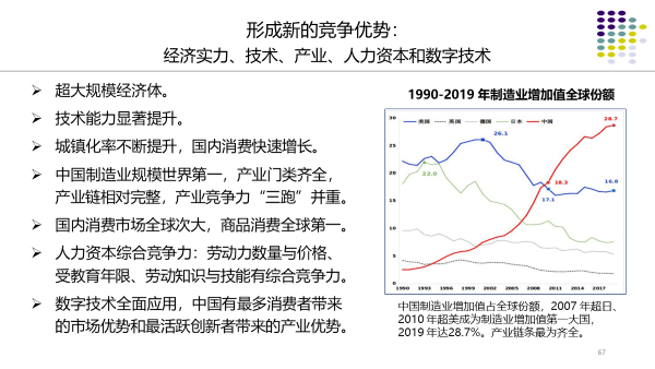 中国制造业规模世界第一。产业门类齐全,产业链相对完整,各类产业竞争力“跟跑”、“并跑”和“领跑”三者并重,并跑和领跑部分快速增加。