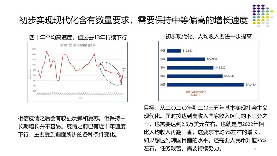 今后我们的发展目标是:全面建成社会主义现代化强国。总的战略安排是分两步走:从二〇二〇年到二〇三五年基本实现社会主义现代化;从二〇三五年到本世纪中叶把我国建成富强民主文明和谐美丽的社会主义现代化强国。基本实现现代化,经济发展和人民生活达到较高水平,是综合性基础性的要求。按照联合国的标准,2021年,人均GNI(人均国民总收入,国际通用指标,在当下中国可以简化理解为GDP)高于12695美元就进入到高收入国家行列,中国人均GNI达到12441美元,已站到高收入国家门槛上。到2035年,基本实现现代化,我国人均收入水平需要再上一个台阶,按达到高收入国家收入区间的下三分之一,也需要达到人均2.5万美元左右。也就是与2022年相比人均收入再翻一番,这要求经济年均增长5%左右。如果想要达到韩国目前的水平,还需要人民币汇率升值约35%。