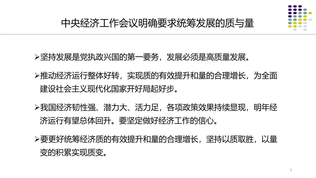今年的经济工作会议对明年和今后的经济工作做了全面的部署,会议再次重申发展是党执政兴国的第一要务,发展必须是高质量发展。会议特别强调要更好统筹经济质的有效提升和量的合理增长,坚持以质取胜,以量变的积累实现质变。会议提出要坚定做好经济工作的信心,为全面建设社会主义现代化国家开好局起好步。