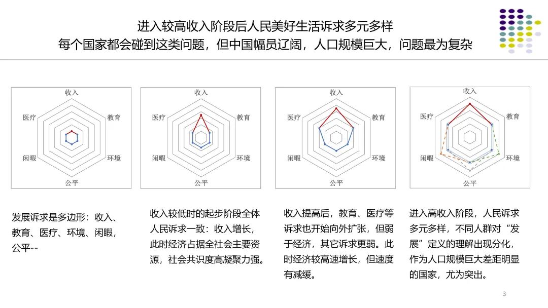 第五是人民群众诉求和国家治理理念发生新的变化。收入较低时的起步阶段全体人民诉求一致,优先发展经济加快收入增长,保障生活基本需求,此时经济占据全社会主要资源,将大量资源配置到经济增长中,社会共识度高凝聚力强。收入提高后,教育、医疗等诉求也开始向外扩张,但弱于经济,其它诉求更弱。此时经济较高速增长,但速度有减缓。进入高收入阶段,人民诉求多元多样,不同人群对“发展”定义的理解出现分化,资源配置要兼顾各方需求,各国都有类似问题,但我国人口规模巨大、城乡区域发展差距较为明显,因此问题尤为突出。国家治理必须回应百姓需求,因此资源配置方向更加多元,用于支撑经济增长的资源虽然比例仍然较高,但权重下降。