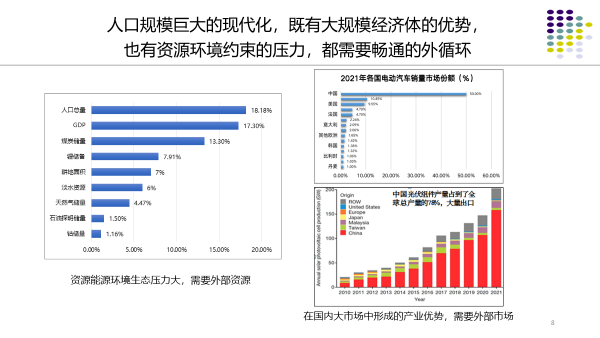 二十大提出中国式现代化,第一条就是人口规模巨大的现代化。人口规模巨大的现代化有优势也有压力,优势是大规模经济体的优势,压力是资源环境约束的压力,发挥优势和化解压力都需要畅通的外循环。
