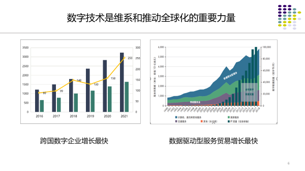 这是由于数字技术跨境连接成本非常低,它在平台上匹配海量双方,以低成本的匹配能力,用数字智能技术推动小件海量物流的畅通等等,特别适合远距离的交易。特别是数字平台上的各种服务交易,对消费端来讲远在天涯或近在咫尺基本无感,疫情期间数字技术支撑这一块的发展更快。