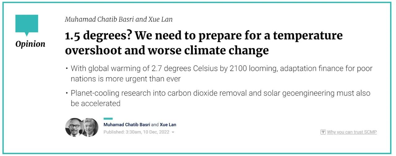 《联合国气候变化框架公约》第二十七次缔约方大会(COP27)于11月6-18日在埃及沙姆沙伊赫举行。当地时间11月17日下午,气候过冲委员会(Climate Overshooting Commission) 在COP27法国角举办了题为”降低温升可能超过1.5℃的风险“的COP27边会。近日,气候过冲委员会委员,清华大学文科资深教授、苏世民书院院长、清华大学全球可持续发展研究院院长薛澜教授以及气候过冲委员会委员、印尼前财政部长Muhammad Chatib Basri(穆罕默德·查蒂布·巴斯里)在《南华早报》发表观点文章:1.5 degrees? We need to prepare for a temperature overshoot and worse climate change(《1.5度?我们需要为气温过冲和最坏的气候变化做准备》),呼吁各方应加强行动为全球温升可能超过1.5℃,及其产生的影响做好准备。以下为文章全文: