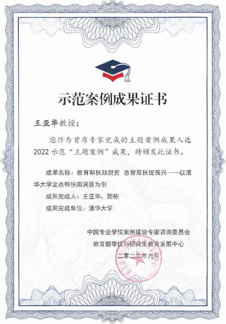 2022年9月17日,首届中国案例建设国际研讨会(2022)举行,首次发布案例研究和主题案例典型成果。会议在教育部社会科学司、教育部学位管理与研究生教育司的指导下,由教育部学位与研究生教育发展中心和清华大学公共管理学院联合主办。王亚华教授领衔团队主题案例中的《教育帮扶助脱贫 志智双扶促振兴——以清华大学定点帮扶南涧县为例》(以下简称“南涧案例”)入选2022示范“主题案例”成果,该案例生动展现了伟大的中国脱贫攻坚战过程中,教育部直属高校对口帮扶地方脱贫的典型做法和主要经验。