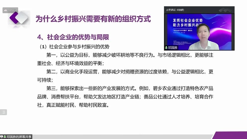 清华大学公共管理学院副院长邓国胜教授以“社会企业是参与乡村振兴的新生力量”为题做了主题演讲。