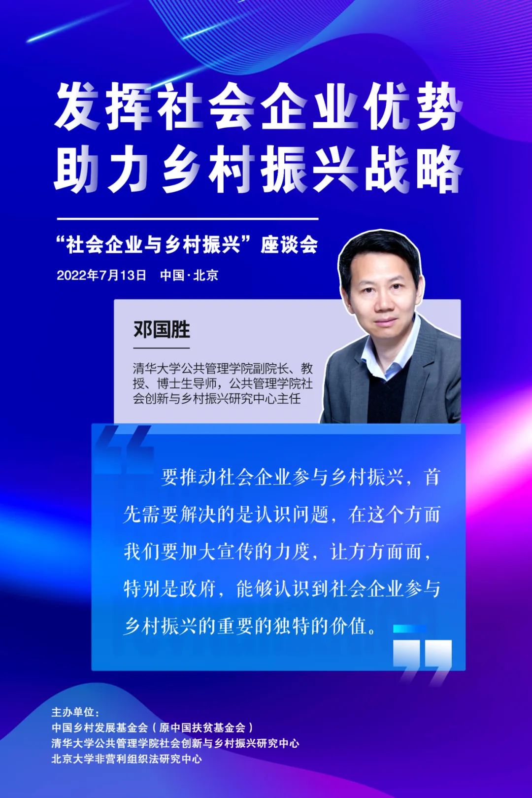 2022年7月13日,由中国乡村发展基金会(原中国扶贫基金会)、清华大学公共管理学院社会创新与乡村振兴研究中心、北京大学非营利组织法研究中心共同主办的“社会企业与乡村振兴”座谈会在京举行。本次会议以“发挥社会企业优势,助力乡村振兴战略”为主题,深入探讨了社会企业如何更好地助力乡村振兴战略。