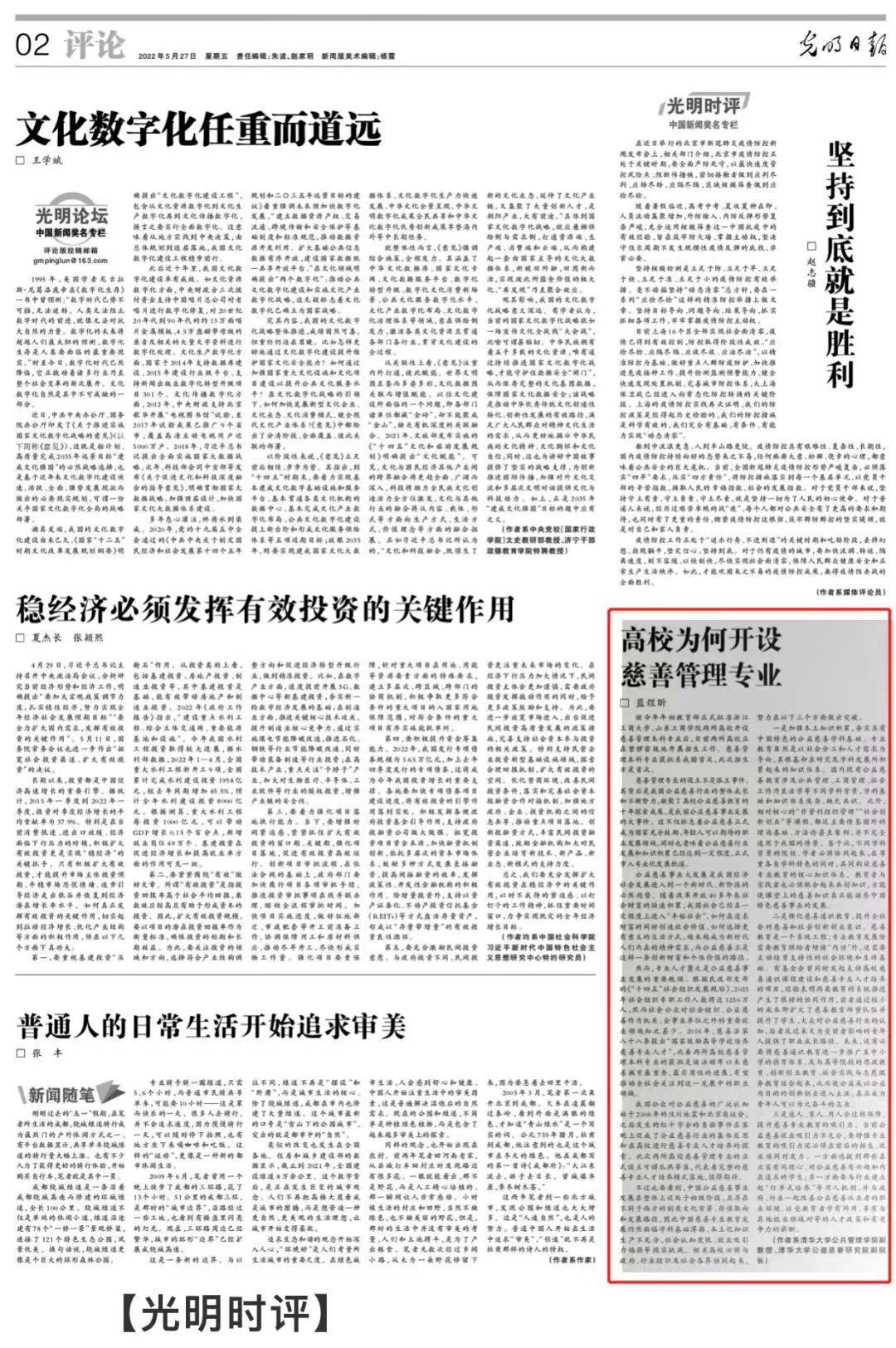 5月27日,清华大学公共管理学院副教授、公益慈善研究院副院长蓝煜昕在《光明日报》发表题为《高校为何开设慈善管理专业》的时评文章,以下为文章全文: