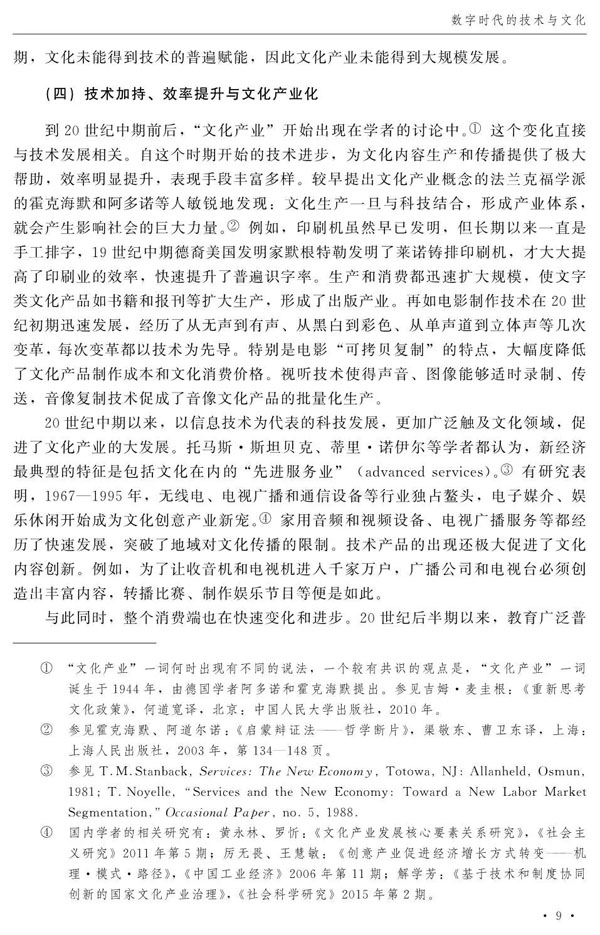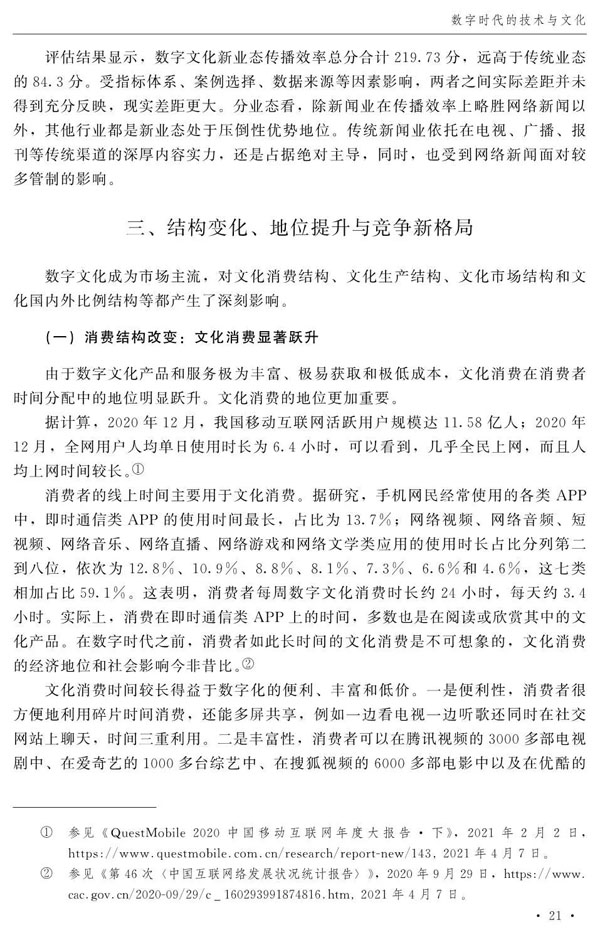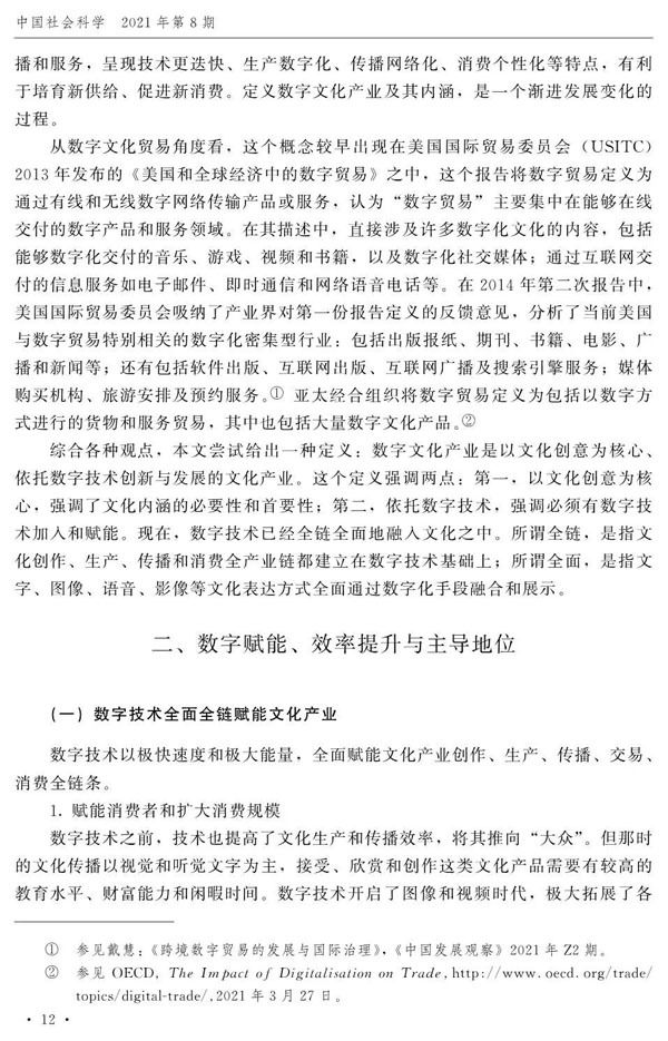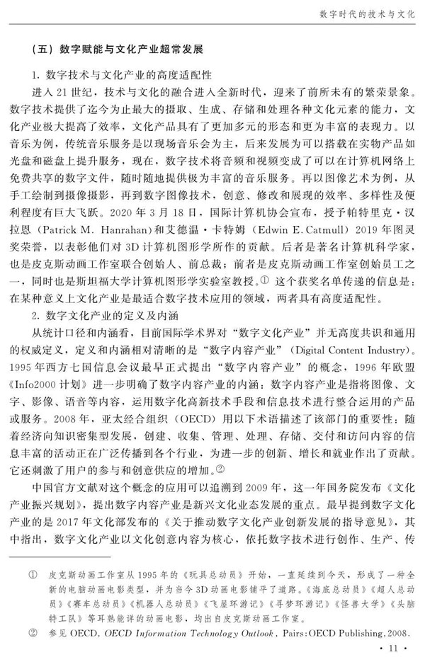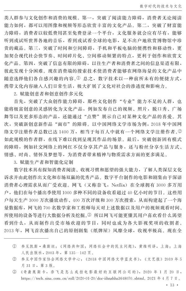 文章指出数字技术极大地推动了文化产业发展,文化产业也成为数字技术最重要的应用领域之一,数字文化产业的现状与未来成为重要研究领域。技术与文化关系的演变分为技术未赋能、技术加持和数字技术赋能三个阶段。可以从赋能消费者、赋能创意者、赋能生产者、赋能社交行为和赋能文化传播五个方面来分析数字技术如何提升文化产业的效率,如何推动数字内容成为文化产业的主体部门和数字传播成为文化传播的主要渠道。