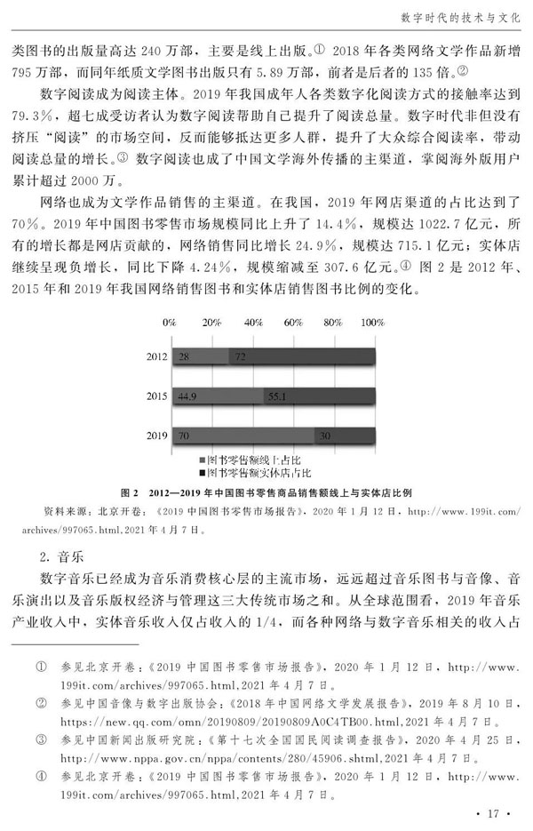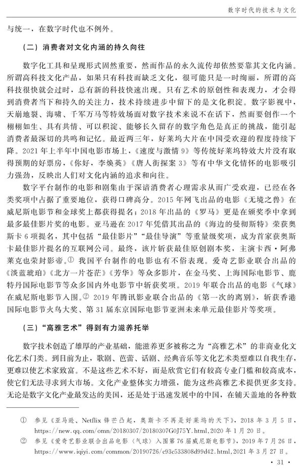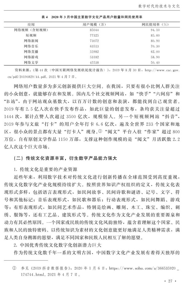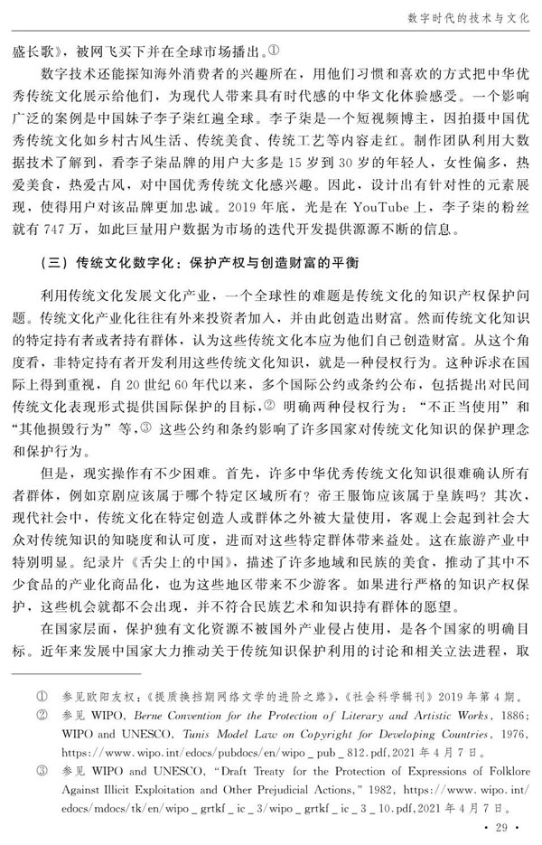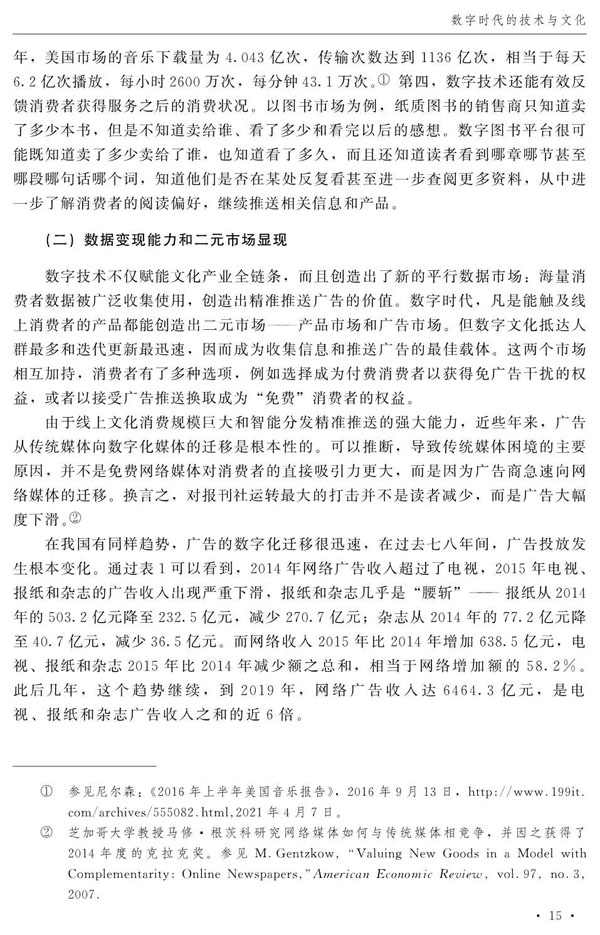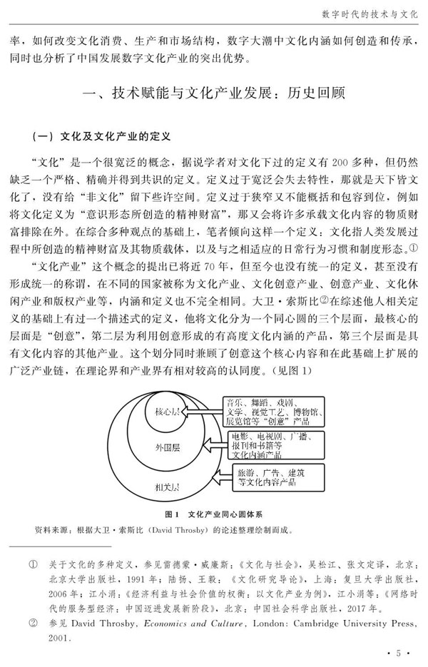 文章指出数字技术极大地推动了文化产业发展,文化产业也成为数字技术最重要的应用领域之一,数字文化产业的现状与未来成为重要研究领域。技术与文化关系的演变分为技术未赋能、技术加持和数字技术赋能三个阶段。可以从赋能消费者、赋能创意者、赋能生产者、赋能社交行为和赋能文化传播五个方面来分析数字技术如何提升文化产业的效率,如何推动数字内容成为文化产业的主体部门和数字传播成为文化传播的主要渠道。