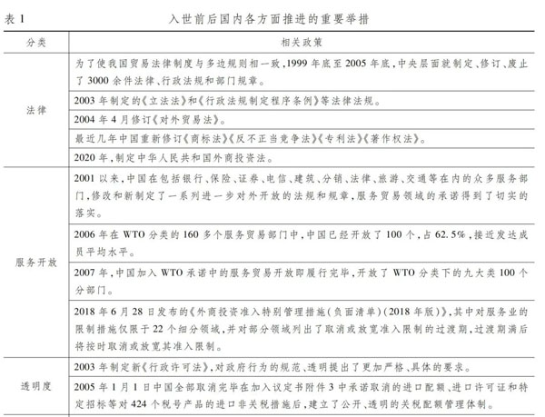 下表是入世前后我们在法律制定、服务业开放、透明度、外贸体制、外资体制等方面推进的重要举措。