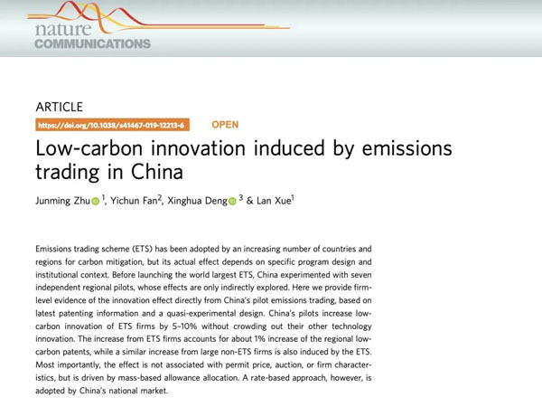 朱俊明、薛澜、邓兴华与樊依纯的论文“Low-carbon innovation induced by emissions trading in China(中国排放权交易引发的低碳创新)”围绕碳排放权交易试点开展研究分析,聚焦政策对低碳技术创新的促进作用及机制。技术创新是我国跨越粗放型发展模式、实现高质量发展的核心驱动力。低碳技术创新是应对气候变化的关键要素,有助于摆脱对碳密集型经济与能源基础设施的路径依赖,在实现减排的同时保持经济活力与竞争力。对气候政策与低碳技术创新关系的准确理解,可以部分缓解碳减排趋势预测的不确定性及其对决策的负面影响,是实现稳定减排的关键。