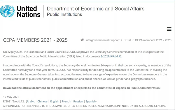 2021年7月22日,联合国经济及社会理事会正式通过了联合国秘书长对24位公共行政专家委员会(CEPA)的专家提名。清华大学文科资深教授,清华大学苏世民书院院长,清华大学公共管理学院学术委员会主任,清华大学全球可持续发展研究院联席院长薛澜作为该24位荣获提名的专家成员之一,将以个人身份担任联合国公共行政专家委员会委员,任期四年,从2021年8月1日起至2025年7月31日止。