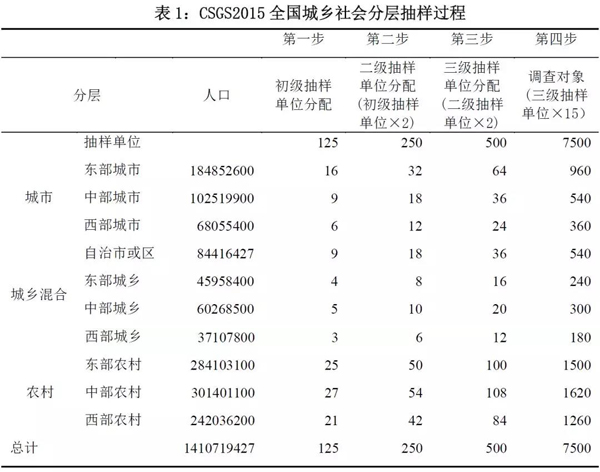 本文使用清华大学及其他合作机构于2015年7月到2016年3月开展的“中国城乡社会治理调查”(ChinaSocialGovernanceSurvey,简称CSGS2015)数据进行分析。CSGS2015是尽可能按照科学的统计抽样方法执行的全国性大规模社会动态入户面访调查。该调查考虑到近年来中国庞大的城乡流动人口问题常常对基层社会随机抽样造成严重的影响,导致家户登记统计经常和实际住户资料存在差异的问题,因此采取全球卫星定位系统(GPS)辅助的概率比例规模抽样方法(GPS-assistedPPSSamplingMethod),以最大限度地反映全国家户人口分布的实际情况。该方法由北京大学国情研究中心开发,旨在解决传统上由于户口登记信息过时、空户过多以及对城乡流动人口的排斥所引发的抽样缺陷和抽样困难(Landry&Shen,2005)。据此,CSGS2015实行了分层和分阶段抽样,首先将全国分为东部、中部和西部三部分,在其中随机抽取区县;然后通过PPS依次抽取乡镇/街道、居/村委会;最后根据空间地理距离在居/村委会内系统抽样抽取。该调查一共抽取了7500个样本,最终有效样本为4068个,回收率为67.65%,是目前可以获得的关于中国公众政治态度的质量最高的调查数据之一。具体的抽样方法和样本情况参见表1: