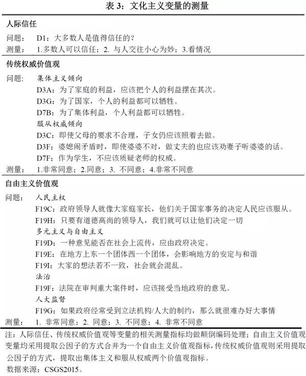 文化变量的设置和测量参见下表,主要包括人际信任和价值观倾向。我们区分了两类典型的价值观倾向:传统权威价值观和自由民主价值观。本文采用Shi(2014)的定义,使用因子分析的方法,对传统权威价值观测量数据提取两个公因子,分别为集体主义倾向和服从权威倾向两个公因子。