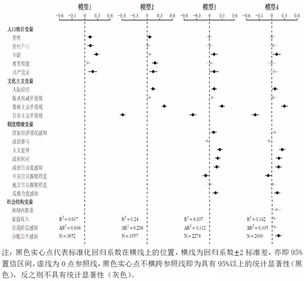 本文通过逐步回归的方式代入文化、制度和社会结构三类变量以检验假设。为了避免统计上的偏误,回归分析中对于缺失值采取了剔除的处理方法。同时,我们采用因子膨胀系数(VIF)检验的方式避免变量间多重共线性的影响;结果显示各变量的VIF值均小于2,由此可以判定变量间不存在严重的多重共线性状况。从模型1到模型4,我们依次检验了人口统计学控制变量、文化主义变量、制度绩效变量和社会结构变量对于中国公民一般性政治支持的影响力,图2将四个模型的回归结果进行可视化展现。