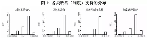 对各类政治制度支持问题的回答的数据分布请参见图1。对制度的信心、以制度为荣、无条件制度支持以及制度选择偏好等四项都处于中立以上的较高水平,说明CSGS2015的调查印证了此前多项研究对中国公民众有高度政治支持的判断。