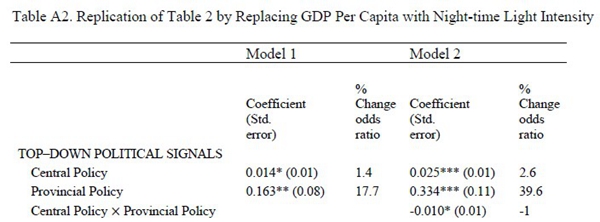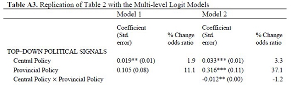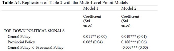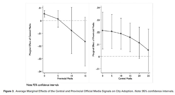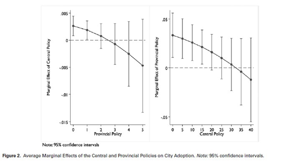 因此,直觉上,在“中央-省-城市”三级政府结构中,当中央政府和省级政府各自发出支持地方政府市场化改革的号召时,下级政府的职业激励和政治约束决定了它们会积极响应中央和省的政策信号。但是,当中央政府和省级政府同时发出政策号召时,城市政府对多重的上级政策信号的响应行为是怎么样的呢?由于地方政府的注意力、时间和资源有限,它们必须策略性地回应来自中央和省的双重压力。具体地,在存在省级政府信号的情况下,市级政府对中央政府信号的响应度就会降低。同理,在存在中央政府信号的情况下,市级政府对省级政府信号的响应度也会降低。换句话说,多重上级政策信号对下级政府行为的影响存在互相竞争而非互相补充的关系。