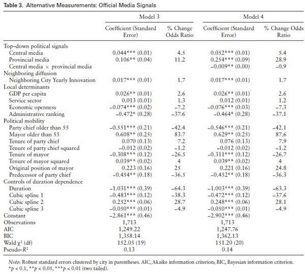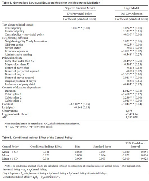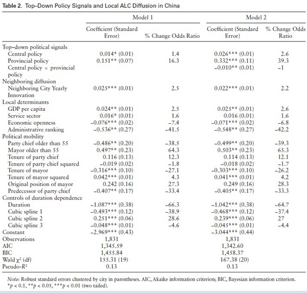 为了回答上述问题,这项研究将府际关系文献与创新扩散文献连结起来,阐释了行政集权对中国地方市场化创新的影响方式。研究者首先分析了中央、省、市各级政府在市场化创新中的动力、约束、权力和行动。例如,中央政府的目标主要是促进宏观经济稳定发展,应对来自WTO的市场化压力,但由于信息和资源有限,中央只能发布一般性的政策指导;省级政府的目标主要是推动经济增长和维护辖区内权力,但面临来自中央政府的政治约束,所以主动发布政策从而一方面因地制宜地指导地方实践,另一方面在回应中央命令的同时维护其在辖区内的政策自主性;市级政府的目标同样是经济增长,但地方领导的时间和资源同样有限,而且多层上级政府的政策信号往往重复甚至存在一定冲突,因而只能在双重上级压力下做出有限的政策选择。