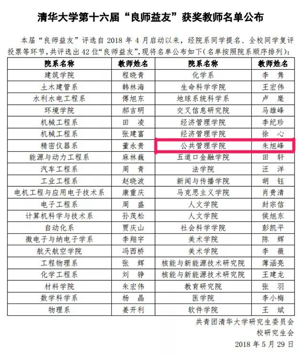5月29日,共青团清华大学研究生委员会和校研究生会联合公布了清华大学第十六届“良师益友”获奖教师名单。本届“良师益友”评选活动自 2018 年 4 月启动,包含院系同学提名、全校同学复评投票等环节,是完全由学生对教师进行提名并投票决定的评选活动。本届活动共评选出 42 位“良师益友”。清华公管朱旭峰教授荣登榜单。