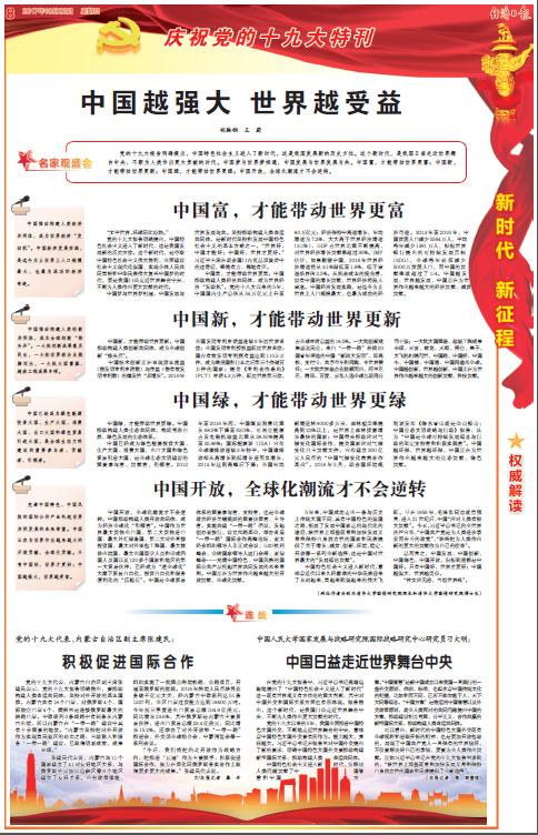 党的十九大报告明确提出,中国特色社会主义进入了新时代,这是我国发展新的历史方位。这个新时代,是我国日益走近世界舞台中央、不断为人类作出更大贡献的时代。中国梦与世界梦相通,中国发展与世界发展与共。中国富,才能带动世界更富;中国新,才能带动世界更新;中国绿,才能带动世界更绿;中国开放,全球化潮流才不会逆转。
