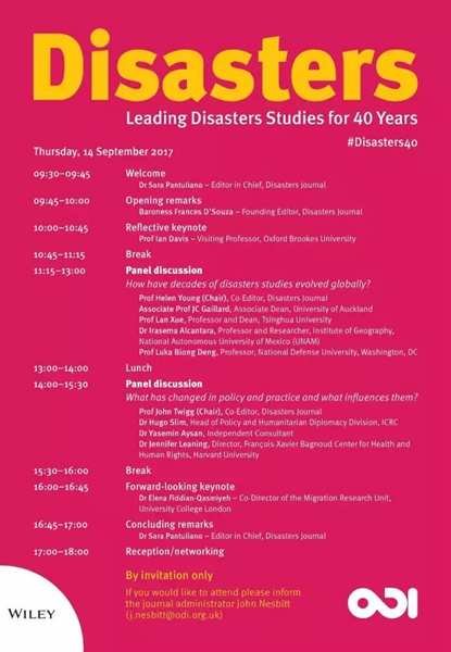 2017年9月14日,国际灾害研究期刊Disasters在海外发展研究所(Overseas Development Institute)举办了建立40周年庆祝活动,清华大学公共管理学院院长、应急管理研究基地首席专家薛澜教授出席,并在“How have decades of disasters studies evolved globally?”论坛中发表演讲。