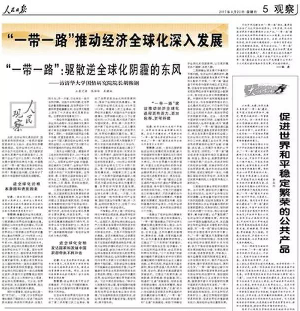 《人民日报》编者按——习近平同志提出的“一带一路”倡议,赢得国际社会广泛认同和积极参与。3年多来,作为促进世界和平稳定繁荣的公共产品,“一带一路”建设为区域及世界经济增长注入正能量,为全球经济治理体系变革增添新动力。当前,世界经济仍然低迷,经济全球化遇到波折,一些西方国家逆全球化思潮暗流涌动。国际社会公认,“一带一路”建设是世界各国新的发展机遇,是当今世界“最好的全球化发展模式”。西方国家逆全球化思潮产生的原因是什么,发展下去会产生什么后果?“一带一路”建设在经济全球化中发挥着什么作用?4月24日,《人民日报》整版刊发记者访谈和专家文章,对此进行探讨。