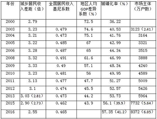(数据来源:国家统计局编:《中国统计摘要2016》,第17页,第59页,第63页;国家统计局:《中华人民共和国2016年国民经济和社会发展统计公报》,2016年2月28日;地区人均差异系数系作者计算;城镇化率括号内为户籍人口比例;市场主体数据来源:国家工商管理总局,括号内数据系占总人口比(%)。)