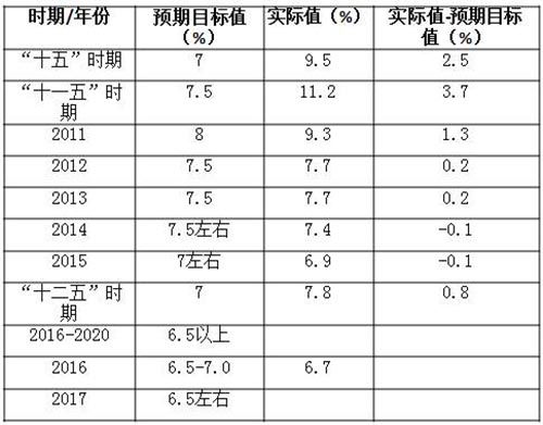 表6 中国经济增长率预期目标值与实际值(2001-2020)