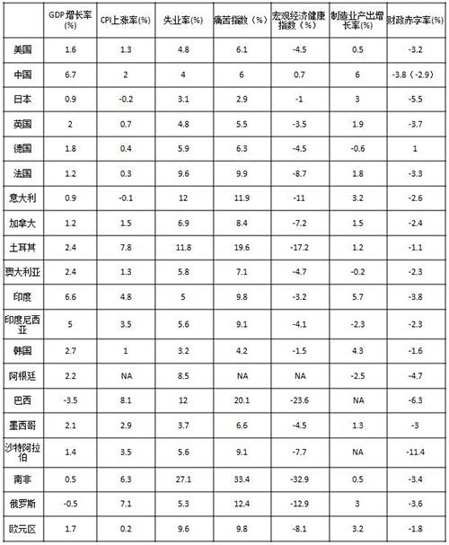 第三个我们还是要从G20这个20个国家做一个横向对比。我们把英国《经济学家》提供的GDP增长率、CPI上涨率、失业率、工业增长率、财政赤字率以及CPI上涨率和失业率构成的所谓“痛苦指数”做一个对比(见表1)。