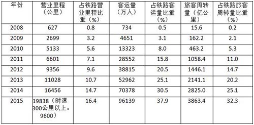 表8 高速铁路主要指标(2008-2015)