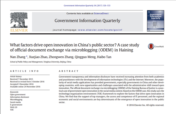 近日,清华大学公共管理学院张楠、赵雪娇、张钟文孟庆国、谭海波合作撰写的论文《哪些因素驱动中国公共部门的开放创新:基于海宁“微博公文”的案例研究》(What factors drive open innovation in China's public sector? A case study of official document exchange via microblogging (ODEM) in Haining在国际信息管理与电子政务领域顶级学术期刊《政府信息季刊》(Government Information Quarterly20171发表。