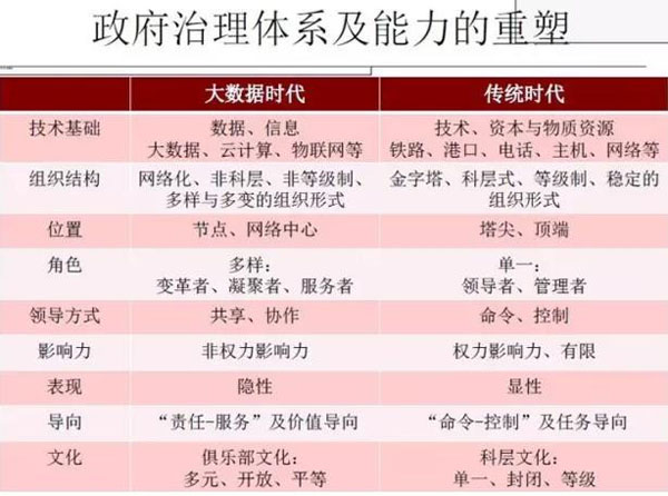 政府1.0是强调以政府为中心,2.0强调以公众中心,3.0强调以每个人为中心。从其所追求的价值来看,政府1.0强调追求的效率,2.0强调的不但是效率还有效果,效果是满意度,服务对象对你评价的满意度,到了3.0时代,即大数据时代,可能不单单强调满意度,还要强调权利,作为一个公民对于信息的知情权、表达权、参与权、监督权,这些东西能不能得到一个体现。