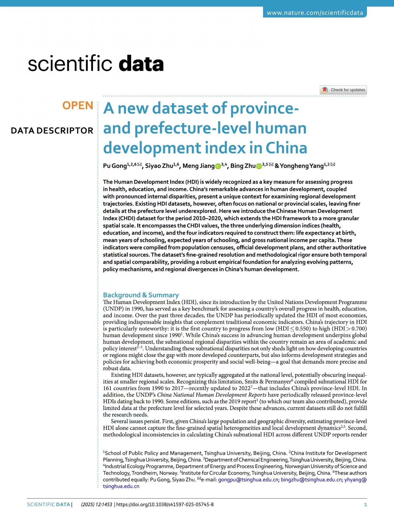 相关成果以“中国省级和地级人类发展指数的新数据集”(A new dataset of province- and prefecture-level human development index in China)为题,于8月20日发表于Nature旗下期刊《科学数据》(Scientific Data)。