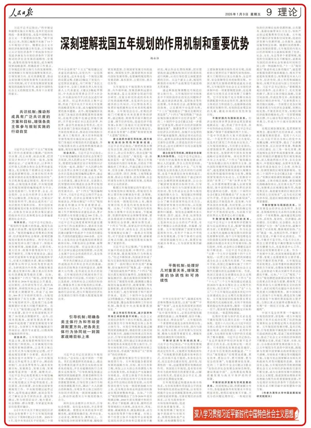 今日,《人民日报》理论版整版刊发清华大学公共管理学院教授、清华大学中国发展规划研究院院长杨永恒署名文章《深刻理解我国五年规划的作用机制和重要优势》,现原文转发,以飨读者。