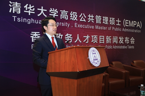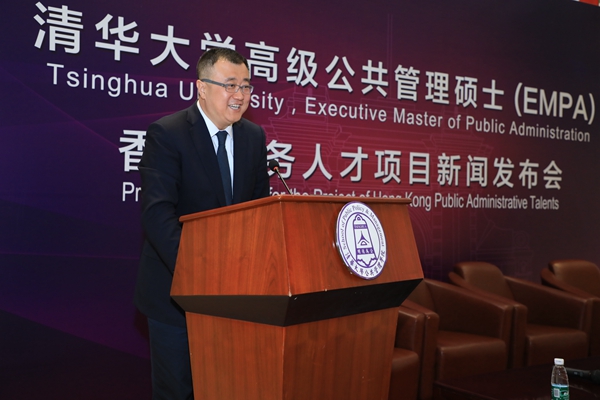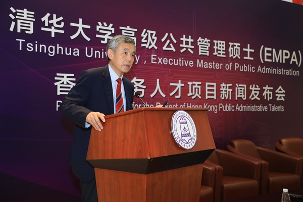 杨斌在致辞中表示,这个项目是中国内地高校中首个面向香港特别行政区招生的高级公共管理专业硕士学位项目,清华大学很高兴能成为这项颇有意义的专业学位教育项目的开创者。在过去的21年中,香港的发展日益与祖国的发展紧密地联系在一起,粤港澳大湾区的规划、全世界最长的跨海大桥港珠澳大桥的建设和“一带一路”倡议的提出等发展表明,香港需要更多知国情、懂港情,根植中国、面向世界的高级公共管理人才。他强调,培养一流人才是清华大学的重大使命。培养一流人才,离不开一流的教师队伍。近年来,清华大学师资队伍水平稳步提高,这为清华大学创办该项目提供了充足的师资力量和优越的教学科研条件。最后,他表达了对项目将会培养出的面向新时代中国改革实践前沿及香港治理实际需求的高级公共管理人才的殷切期望。